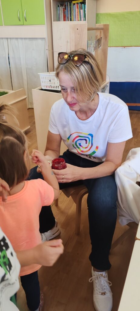 Djeca dobi od 3 do 6 godina veselo su pozdravila tete iz Udruge Bez granica koje su im došle u posjet. Teta Vesna i teta Kristina koju su kasnije djeca zvala Kiki sa zanimanjem su pratili što su im tete donijele i što će im ispričati. Kao poklon donijele su marmeladu i sirup od drenjula, fanzin drenjule i jednu slikovnicu sa pričom.